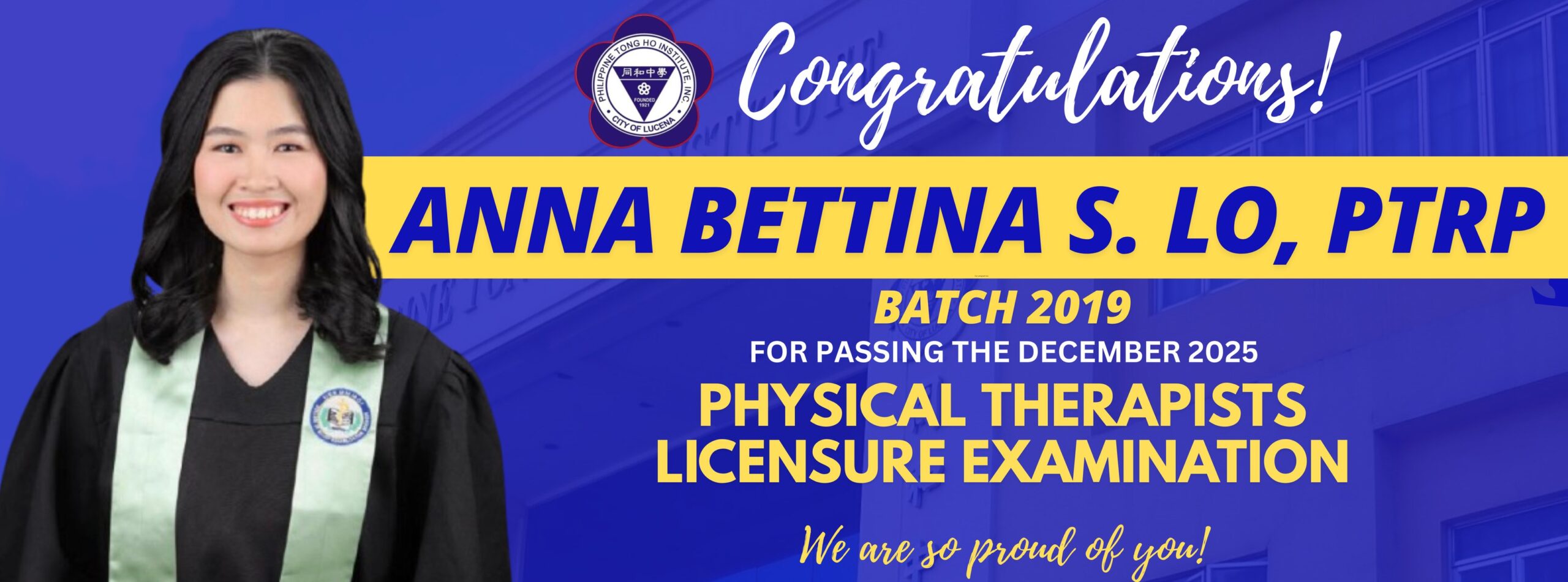 Alumni Corner January 5, 2026January 5, 2026 Hats off to ANNA BETTINA S. LO, PTRP! For passing the DECEMBER 2025 PHYSICAL THERAPISTS LICENSURE EXAMINATIONS We are so proud of you!