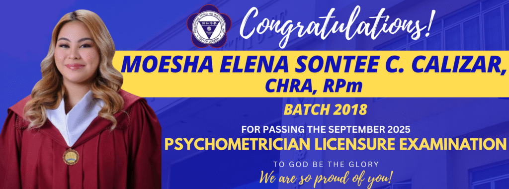 Alumni Corner October 6, 2025October 6, 2025 Hats off to MOESHA ELENA SONTEE C. CALIZAR, CHRA, RPm! For passing the September 2025 PSYCHOMETRICIAN LICENSURE EXAMINATIONS We are so proud of you!